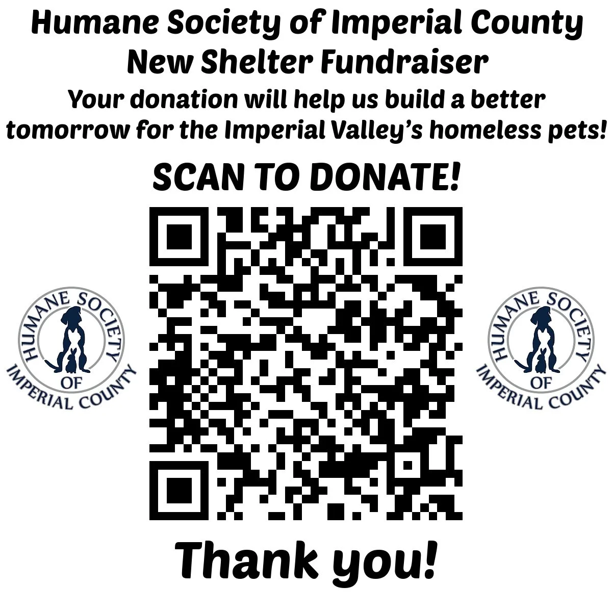 If you prefer to send your donation via check, great! Please make checks payable to HUMANE SOCIETY OF IMPERIAL COUNTY. Please make sure to make note in the memo that your donation is for the New Shelter Project. We can manually add your check donation to this fundraiser so the amount will appear in the Donation Thermometer. Our address is 1575 W. Pico Ave. El Centro, CA 92243
